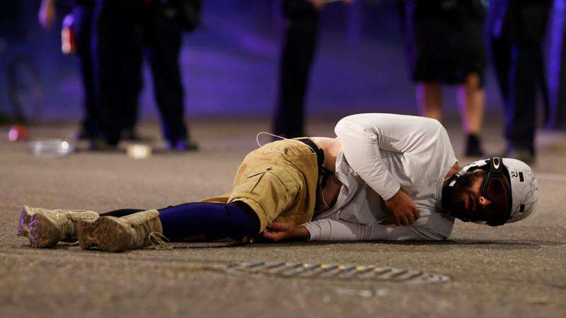 A man who had fallen on 14th Street lands again on the street after he was cleared by Denver police following the use of tear gas and rubber bullets to disperse a protest outside the State Capitol over the Monday death in Minneapolis police custody of George Floyd, a handcuffed black man, Thursday, May 28, 2020, in Denver.