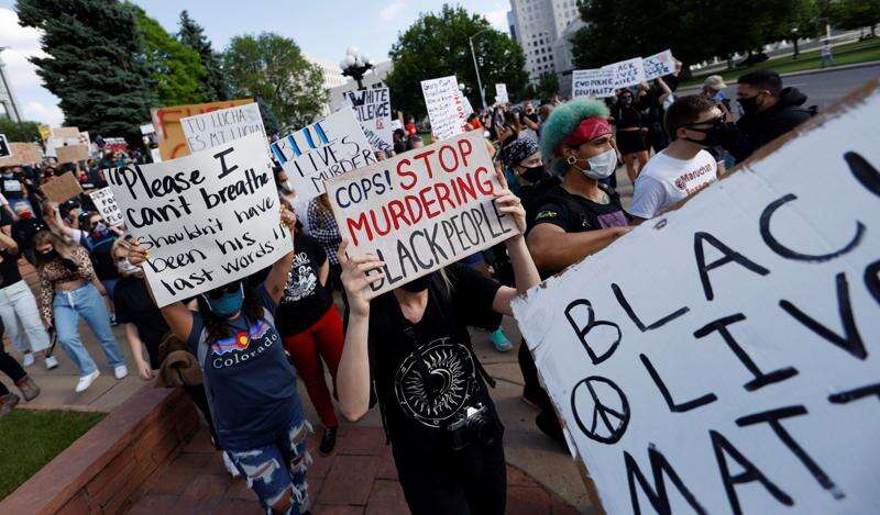 Participants carry placards during a protest outside the State Capitol over the death of George Floyd, a handcuffed black man in police custody in Minneapolis, Thursday, May 28, 2020, in Denver. Close to 1,000 protesters walked from the Capitol down the 16th Street pedestrian mall during the protest.
