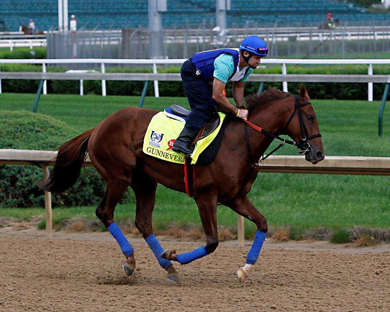 Kentucky Derby 143 hopeful Gunnevera, ridden by exercise rider Victor O’Farrel, gallops at Churchill Downs in Louisville, Ky., Sunday, Apr. 30, 2017.