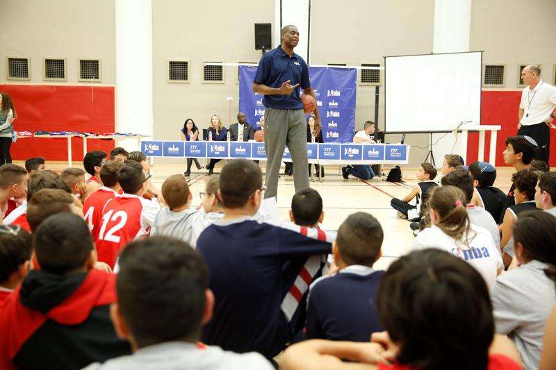 Mutombo, an eight-time NBA All-Star who played for six teams, was in town for the inauguration of a new sports center, where he flashed his signature finger-wag and showed off his trademark shot-blocking skills at a clinic in front of a mixed crowd of excited Jewish, Christian and Muslim children.