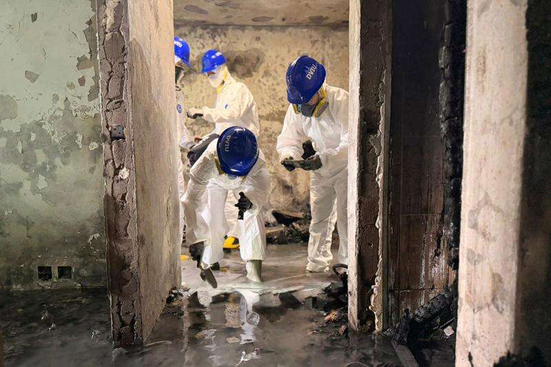 In this photo released by Hong Kong Police Public Relations Branch, members of the Disaster Victim Identification Unit work in an apartment in the aftermath of a deadly Wednesday fire at Wang Fuk Court, a residential estate in the Tai Po district of Hong Kong's New Territories Sunday, Nov. 30, 2025. (Hong Kong Police Public Relations Branch via AP)