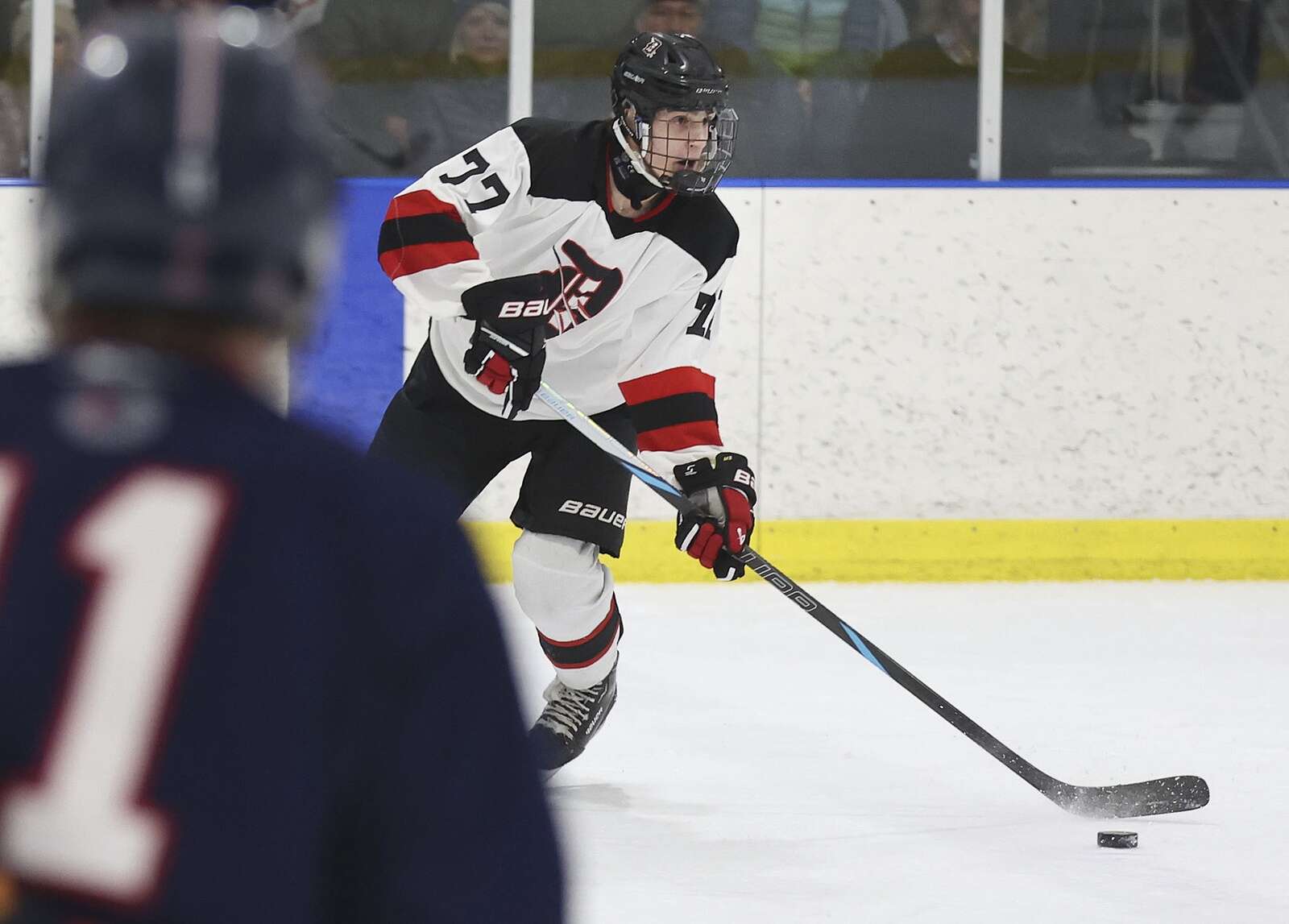Sawyer Jones of Durango High School looks to pass the puck while playing Kent Denver on Feb. 22 at Chapman Hill Ice Rink in the first round of state playoffs. (Jerry McBride/Herald file)