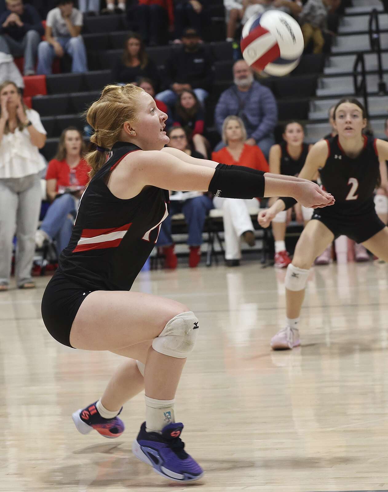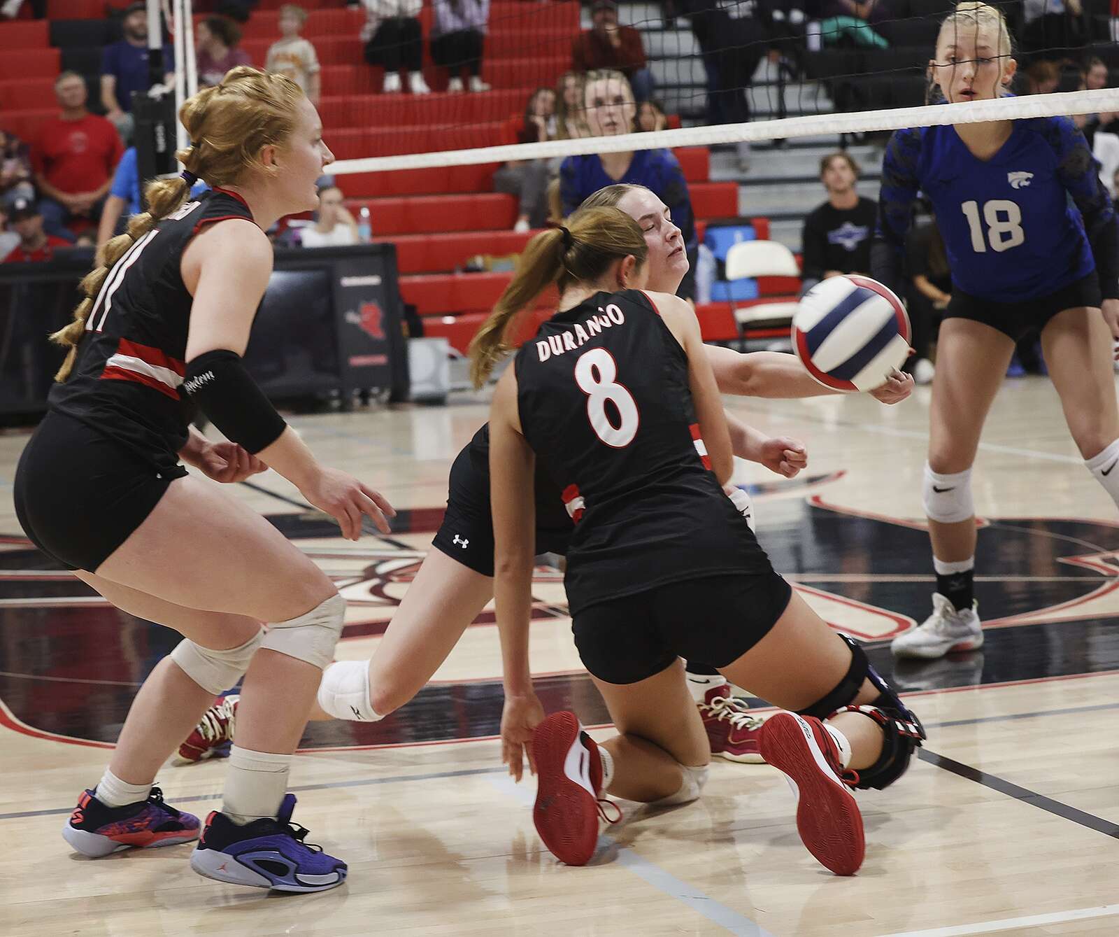 Devyn Edwards of Durango High School goes low for the ball while playing Fruita Monument High School on Friday at DHS. (Jerry McBride/Durango Herald)