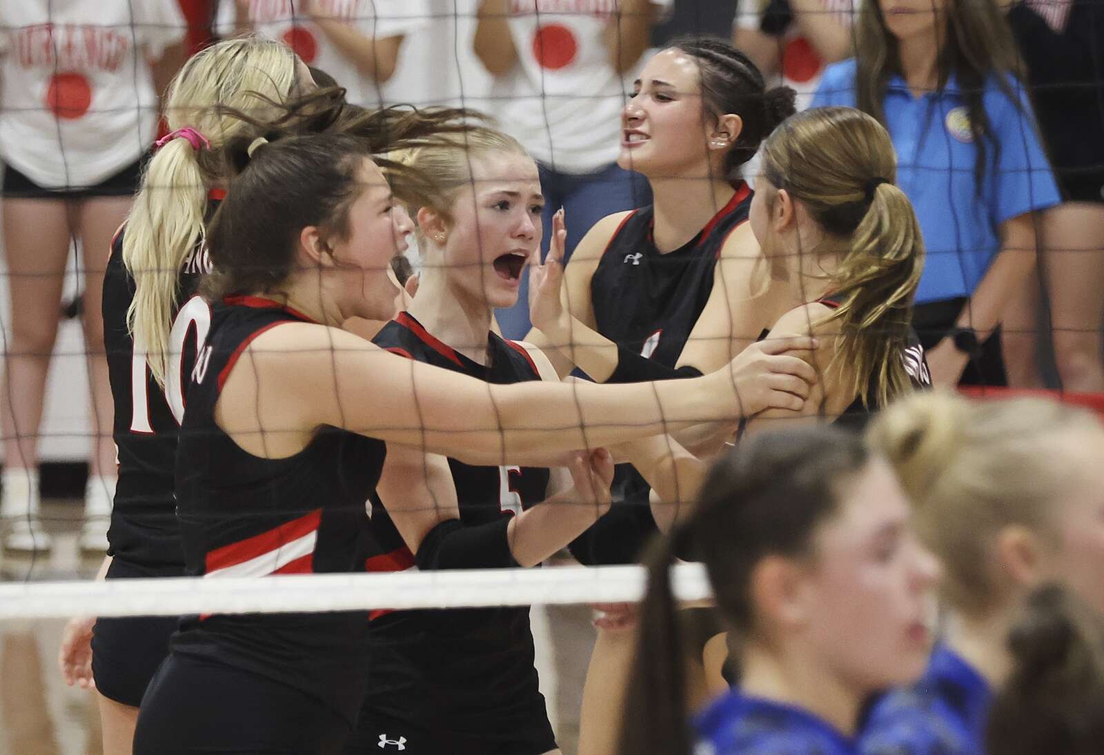 Durango High School volleyball players celebrate a point against Fruita Monument High School on Friday inside Durango High School. (Jerry McBride/Durango Herald)