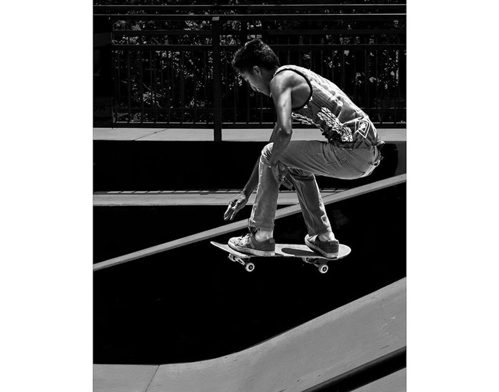 Nine starkly beautiful images of skateboarders at an annual memorial event fill the display case. Wisely printed in black and white, they are elegant scenes of stark beauty.