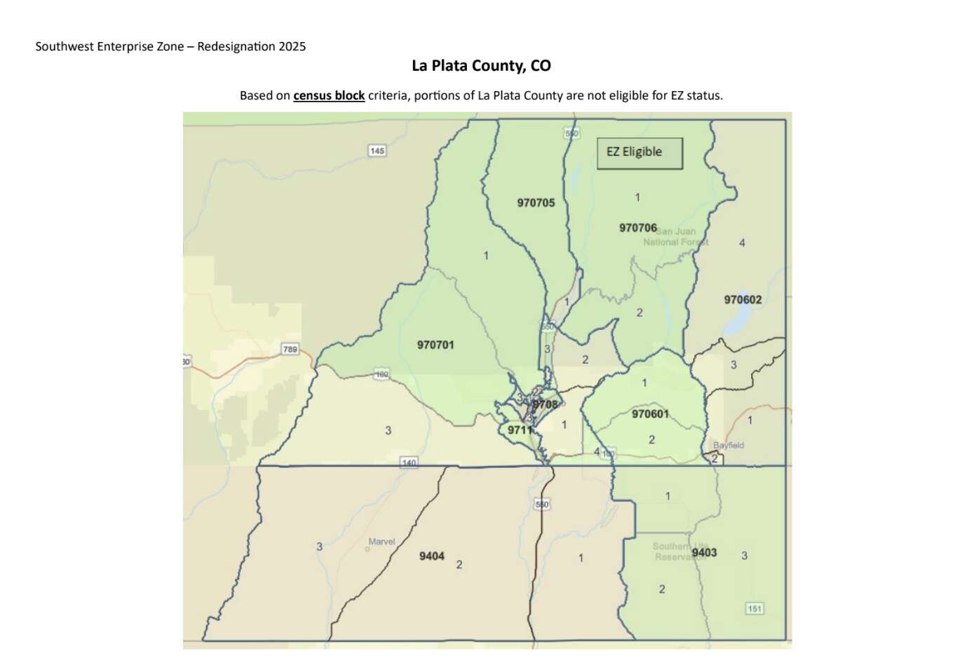 All of Montezuma, San Juan and Archuleta counties and nearly all of Dolores County have been determined to be within the 2026 rezoning, but only some parts of La Plata County have been designated as “distressed” and in need of Enterprise Zone credits.