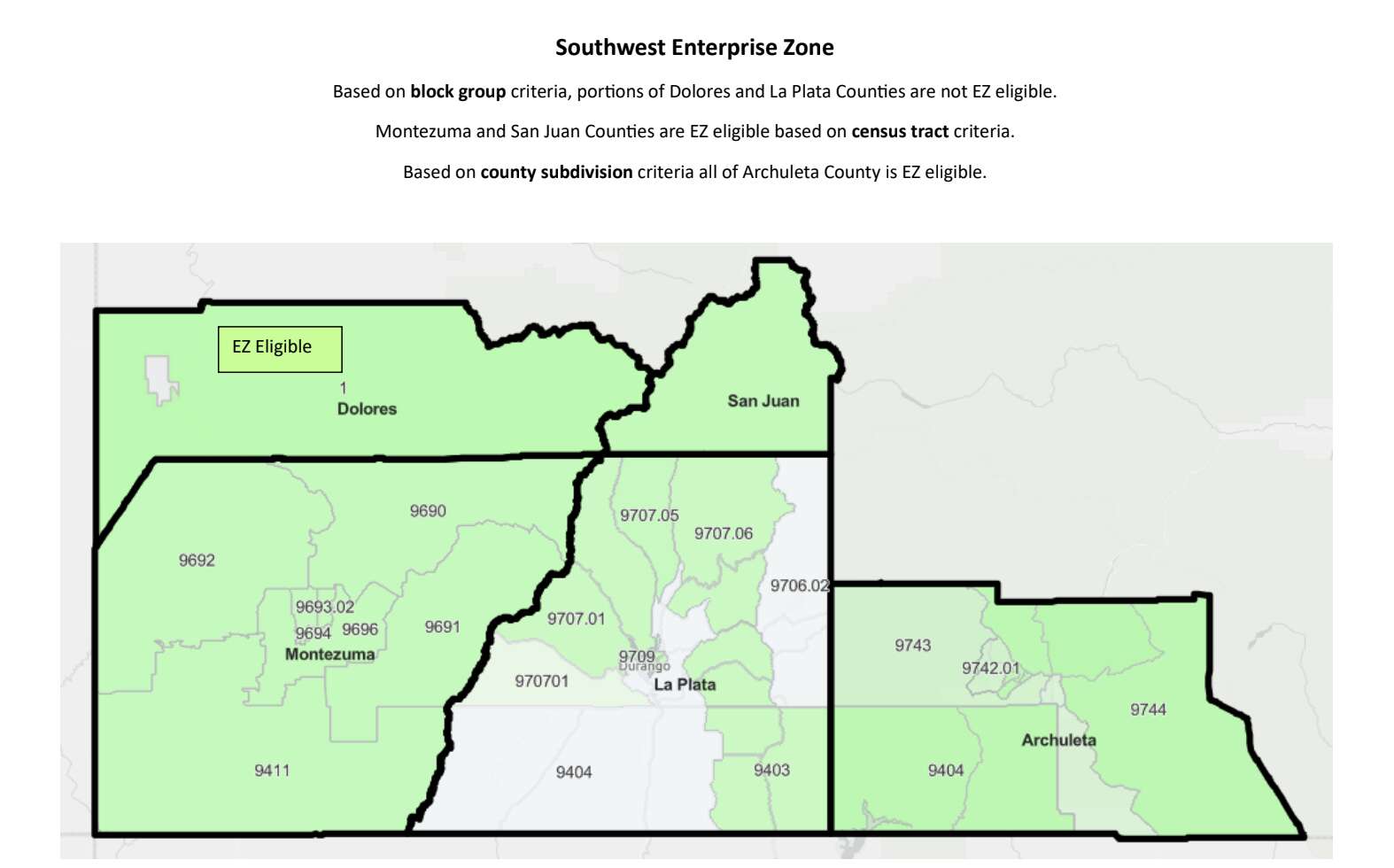 Dolores, Montezuma and San Juan counties, as well as most of Archuleta and parts of La Plata counties, have been located within the Southwest Enterprise Zone boundary throughout the past 10-year cycle. All of those counties are overseen by the Region 9 Economic Development District of Southwest Colorado.