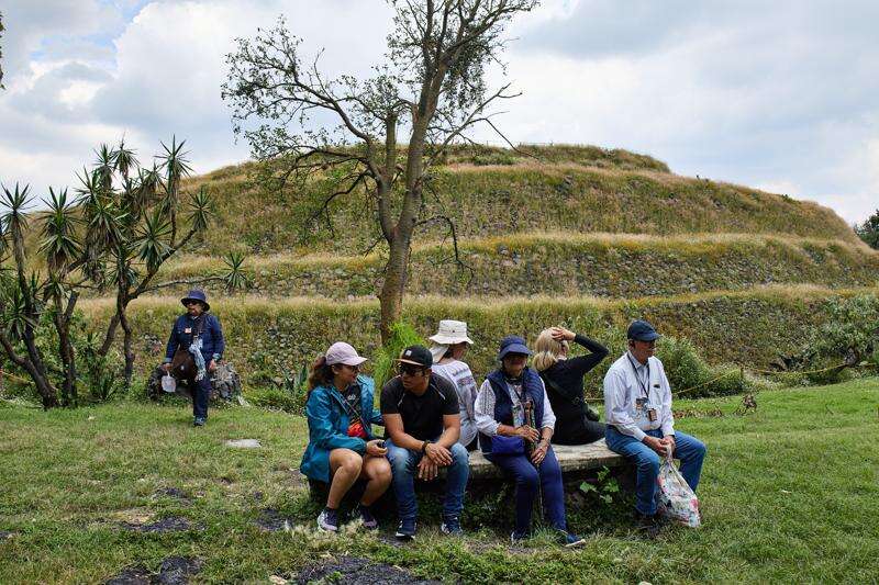 Tourists sit by the Great Basement of the Cuicuilco Archaeological Zone during a tour organized by the National Institute of Anthropology and History in Mexico City, Sunday, Oct. 5, 2025. (AP Photo/Ginnette Riquelme)