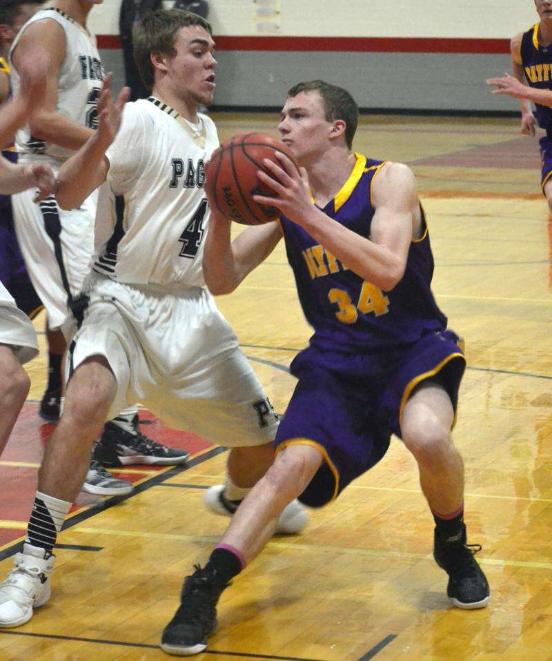 Bayfield's Hunter Killough (34) slams on the brakes and attempts to lure Pagosa Springs' Ty Kimsey (4) out of his defensive position during Intermountain League District Tournament semifinal play last Thursday at Centauri Middle School in La Jara. The team took third at district competition. The Wolverines take on Colorado Springs Christian School tonight in Arvada in the 3A Round of 32. For more coverage of Wolverine and Bobcat basketball as they head to regionals, see Sports.