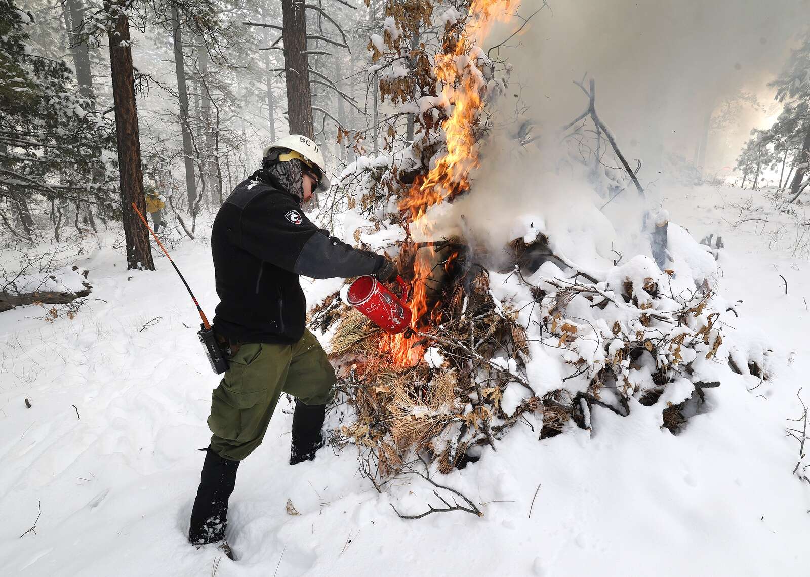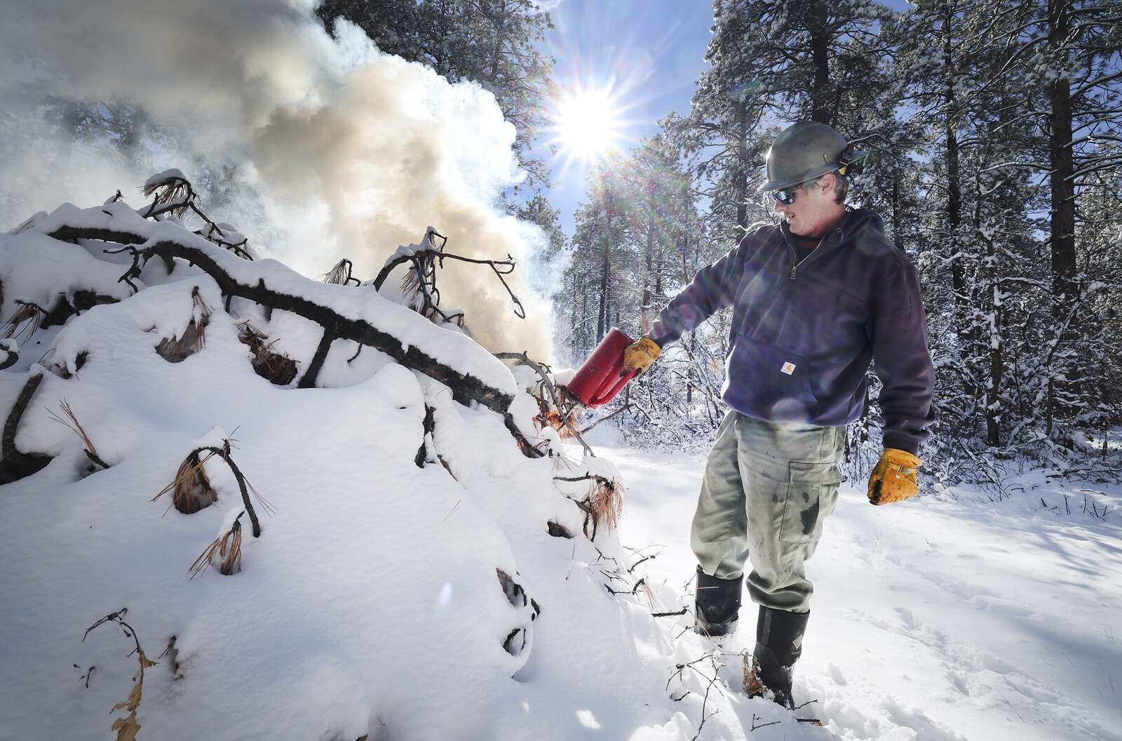 On Friday, Nielsen and six DFPD firefighters gathered in a snowy, forested glade next to the Durango West I subdivision to set several hundred slash piles and downed timber on fire. They sparked up their drip torches – metal cans with a nozzle in one end containing a mixture of gasoline and diesel – then went to work, igniting one pile after another, each one gradually springing into a 10-foot-high bonfire.