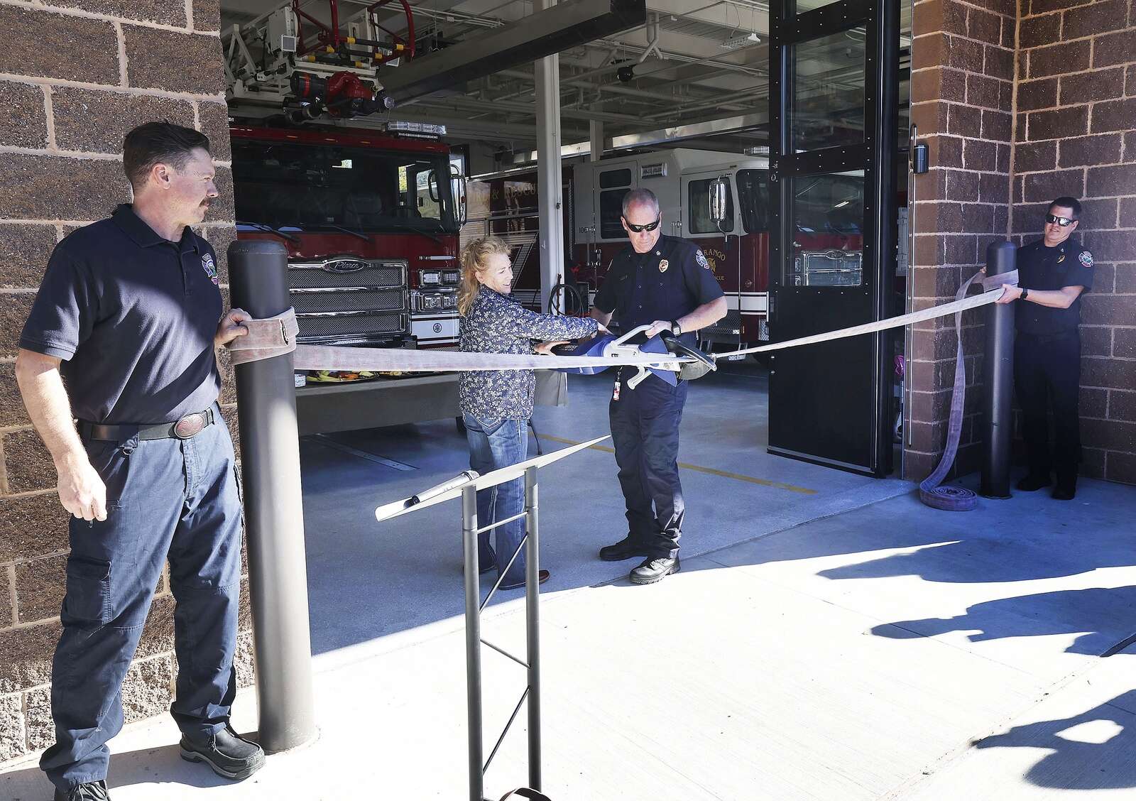 A “ribbon cutting ceremony” featured Black using Jaws of Life to cut a fire hose outside one of the apparatus bay doors, which he did to applause.