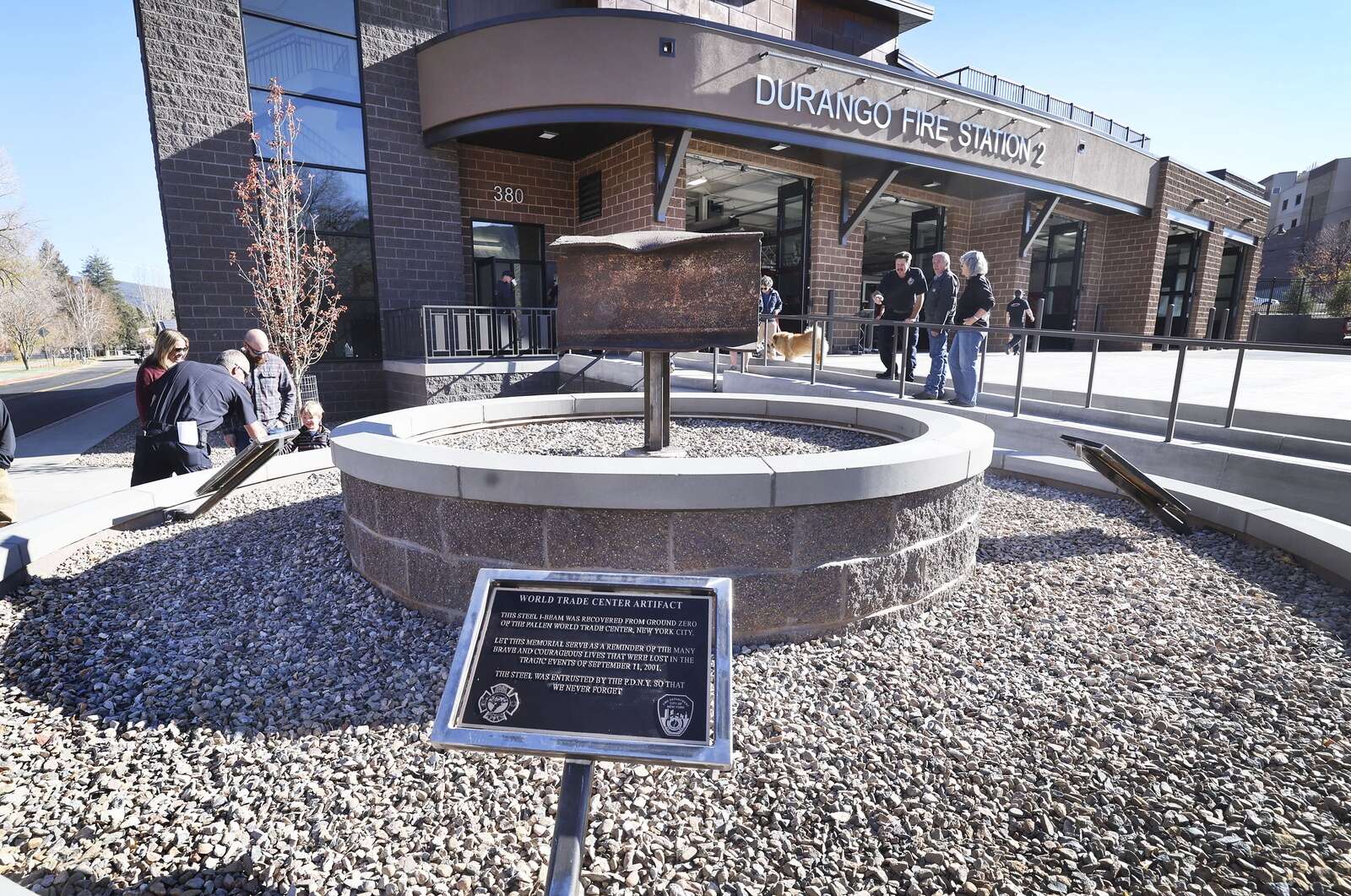 The memorial is located outside the fire station beside a flagpole and centerpieces an I-beam recovered from Ground Zero at the World Trade Center after the Sept. 11, 2001 attacks.