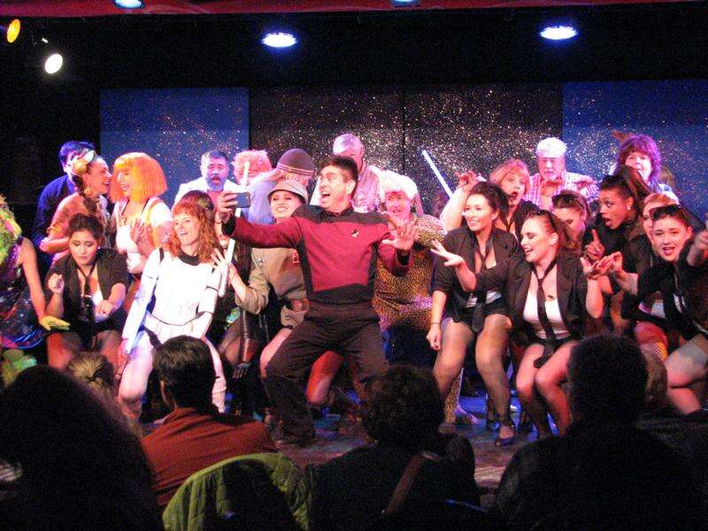 A Star Trek-clad fan, center in red, jumps on the stage Tuesday at the end of the media night performance for a galactic selfie.