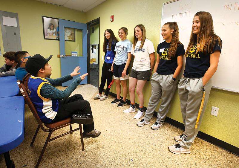 Alyssa Lujan, 9, asks a question on Thursday to Fort Lewis College athletes from left, women’s basketball players Hanna Valencia and Sydney Candelaria as well as softball’s Madelynne Blood-Smyth, Kylie Hefley and McKenna Hefley during a panel discussion at the Boys & Girls Club of La Plata.