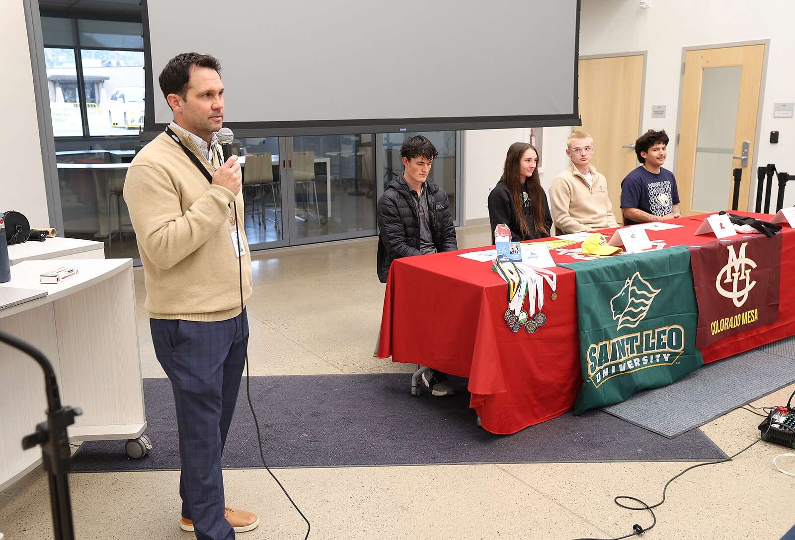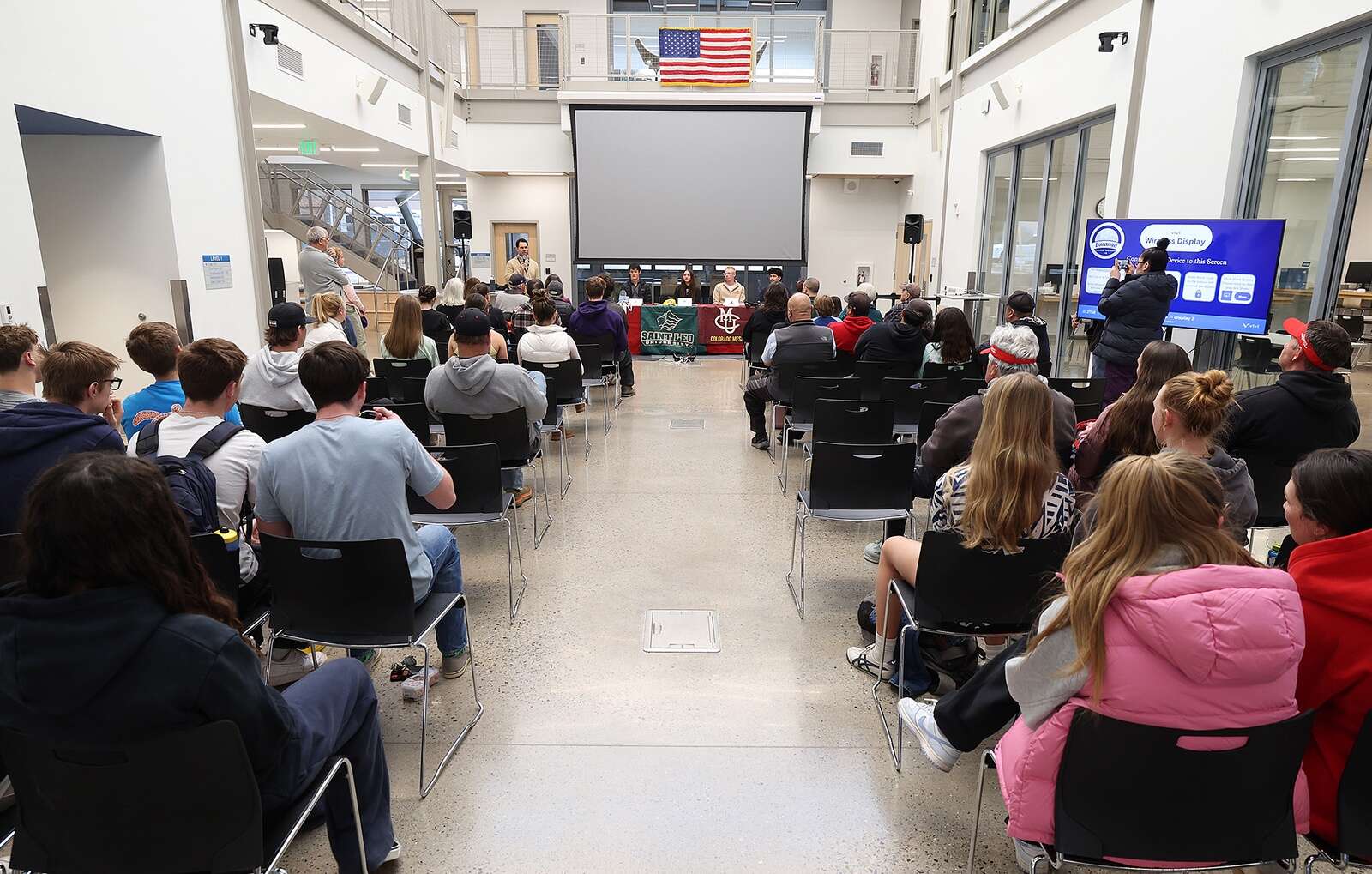 Nolan Pace, Juliana McKown, Trevor “Denny” Woods and Landin “Bubba” Padilla participated in a college signing ceremony at the Impact Center at Durango High School as they showed off their future colleges’ colors and logos in front of family, friends, coaches and teachers.