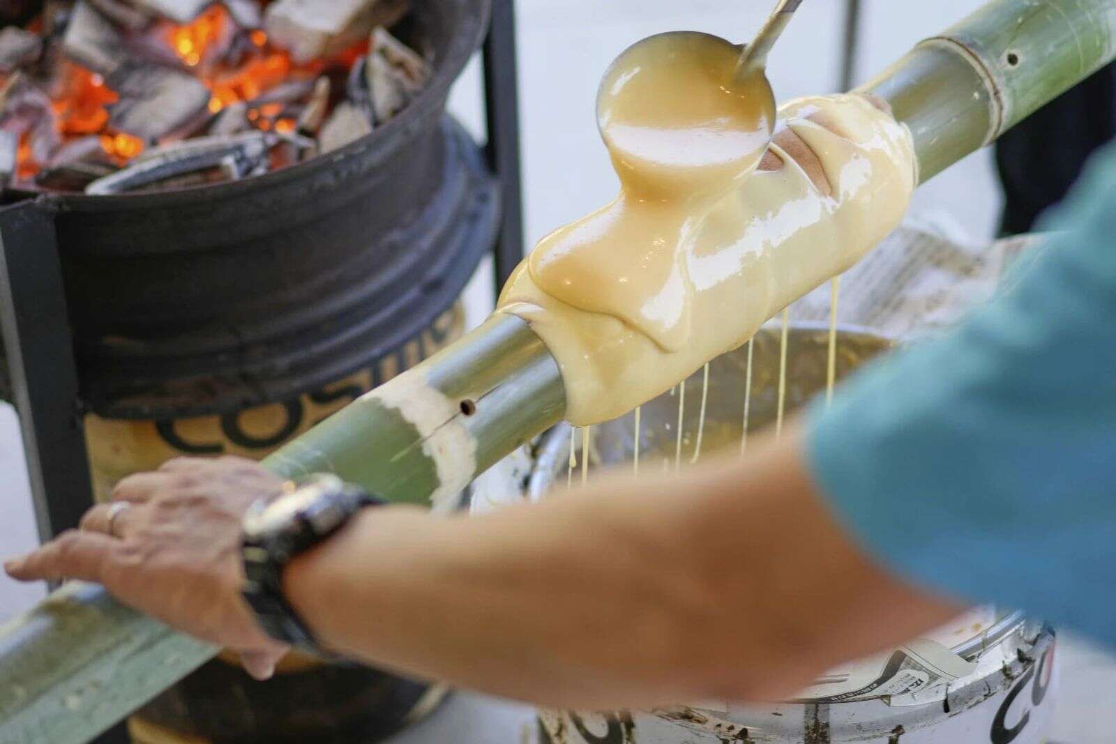 At the outdoor center built over the site of a prisoner of war camp, amateur bakers pour batter on a bamboo pole and roast the mixture over a charcoal fire. As the surface turns light brown, a new layer is poured, creating brown rings as the cake grows thicker and the sweet smell wafts through the picnic area.