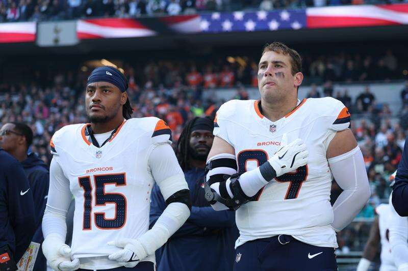 Denver Broncos linebacker Nik Bonitto, left, and defensive end Zach Allen stand for playing of the National Anthem before facing the New York Jets before an NFL football game Sunday, Oct. 12, 20205, in London. (AP Photo/Ian Walton)