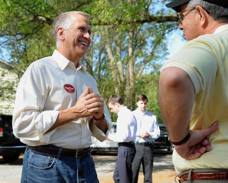 N.C. House Speaker Thom Tillis talks with voter Donald Parrott of Charlotte during Tuesday’s primary election. Tillis beat several anti-establishment challengers in the race to be the GOP candidate for governor.
