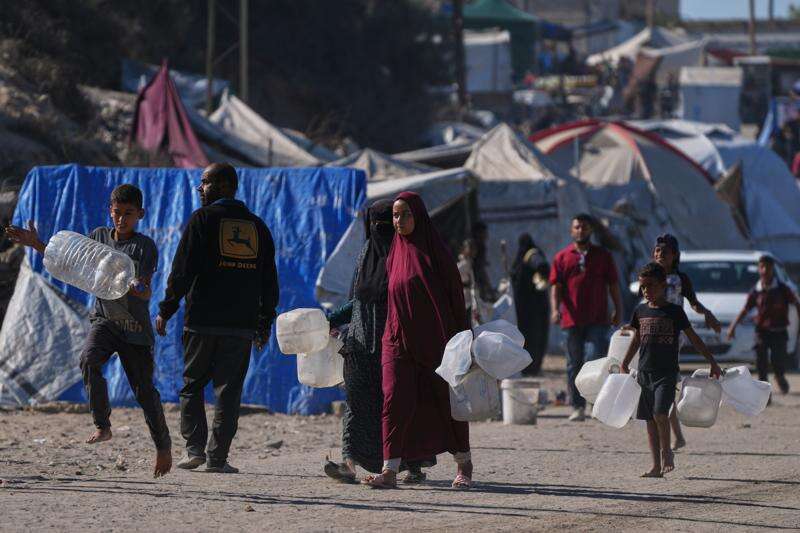 Palestinians carry plastic bottles with water in an area of a makeshift tent camp for displaced people along the shore of Nuseirat, in the central Gaza Strip, Wednesday, Oct. 8, 2025. (AP Photo/Abdel Kareem Hana)