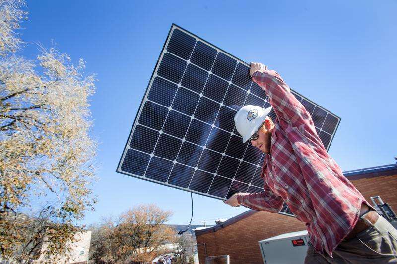 Tyler McKnight helps install solar panels Thursday morning at Mountain Middle School. He’s carrying one of 164 panels that will supply all the school’s current electrical needs. According to Head of School Shane Voss, the using solar power is an important step toward the goal of making the school achieve Net Zero status in the near future. Net Zero means the school produces as much electricity as it consumes.
