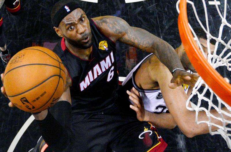 The Spurs opened an 11-point lead early in the second before James got going. He had three consecutive Miami baskets and a follow shot later in the period gave the Heat their first lead at 34-33.