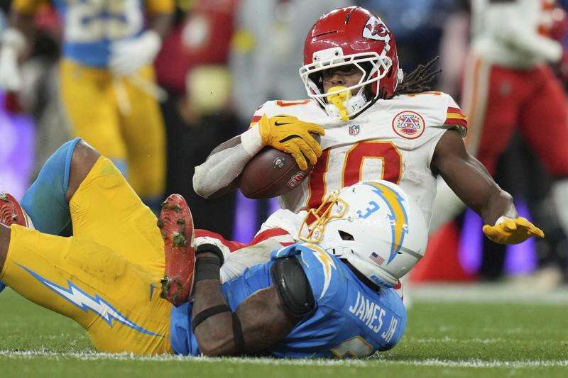 Herbert became just the third quarterback in Chargers history with 300 yards and three TDs in a season opener. His 19-yard run on third-and-14 dashed any comeback hopes the Chiefs had with 2:21 to play. He finished 25 of 34 and was sacked three times.