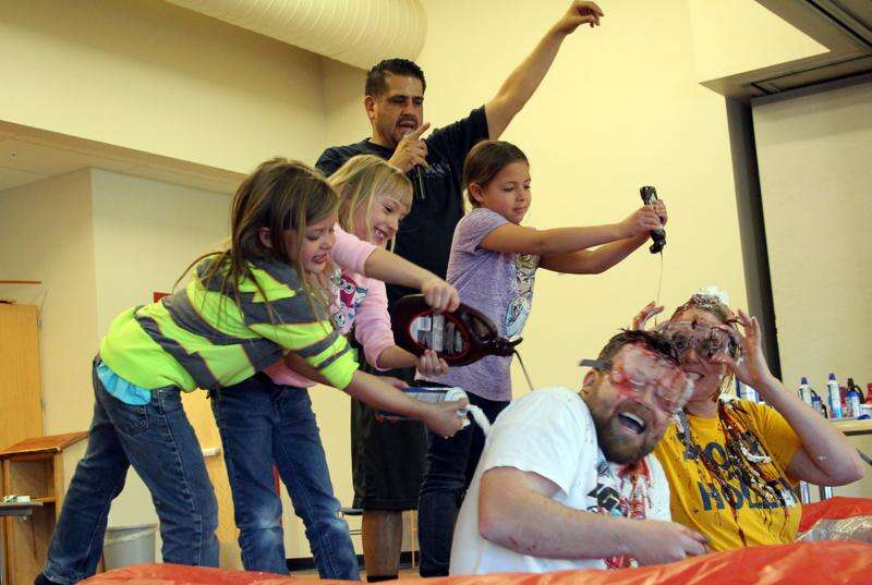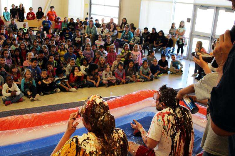 "It was a reward for the kids," said Assistant Principal Willie Machallister, who said children in each grade who performed well in attendance, academics and behavior for the entire trimester got to participate. That came out of 190 students, or 52 percent of the school's pupils. Both Machallister and Principal Kathy Herrera donned sweats and eye protection for the event and sat in a kiddie pool for the students to make their creations.