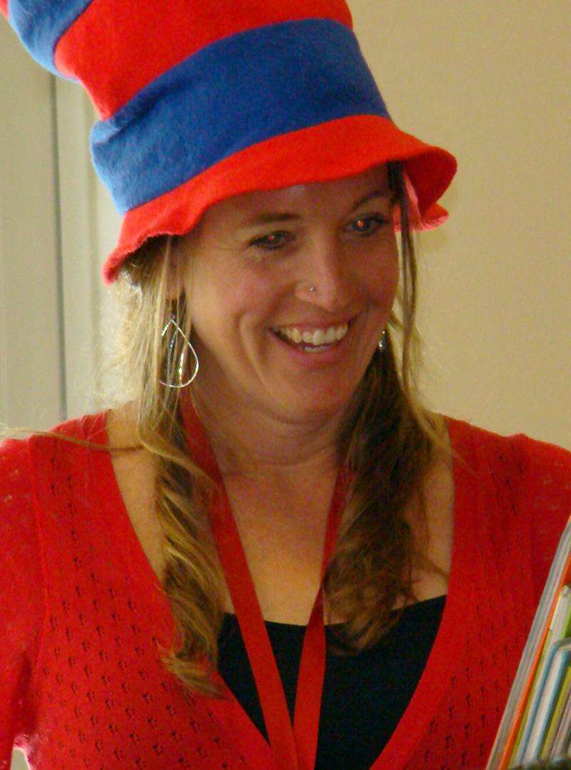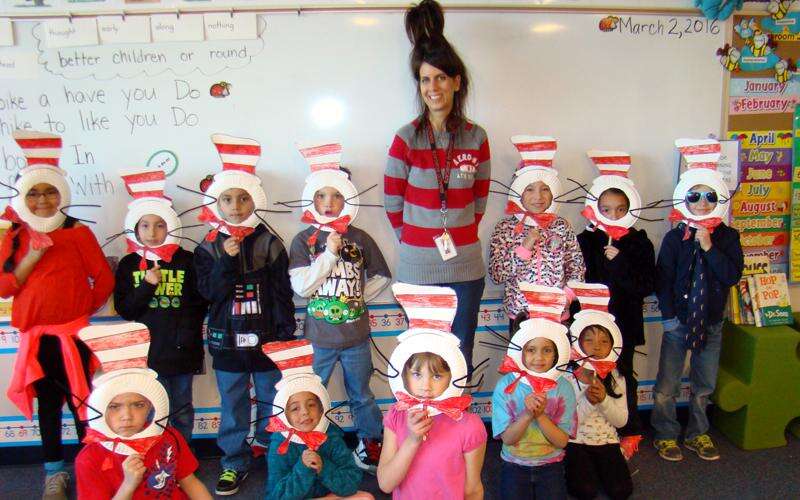Kirstin Harmon shares a smile with her students on Dr. Seuss Day.