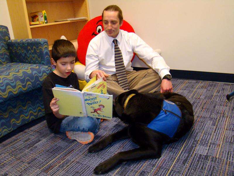 Reading fun continues this month at Ignacio Elementary School. Activities kicked off on March 2, the birthday of Dr. Seuss author Theordore Geisel. Max Montoya, left, reads a book to teacher Jaceson Cole and one of the school's doggy reading buddies, Mellow.