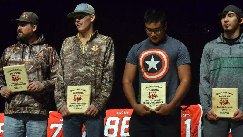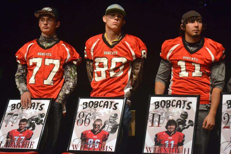 From left, Ignacio football seniors and potential Denver Broncos Dalton Labarthe (77), Timmy Plehinger-Williams (86) and Zach Weinreich (11) listen to head coach Alfonso Garcia's closing comments at the Bobcats' end-of-season banquet and award ceremony last Thursday night inside the IHS Performing Arts Center. Ignacio finished a resurgent 2016 standing 3-6 overall.