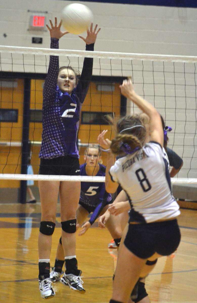 Bayfield's Ashley Mottin (2) lines up perfectly to defend a spike from Piedra Vista Tuesday night Farmington. Bayfield lost in three straight games. See more photos and the story inside in Sports.