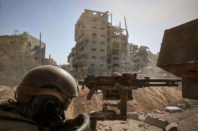 This picture taken during a media tour organised by the Israeli army shows an Israeli army soldier behind a mounted machine gun in the vicinity of the Jordanian Field Hospital in Gaza City, Friday, Oct. 3, 2025. (Jack Guez/Pool Photo via AP)