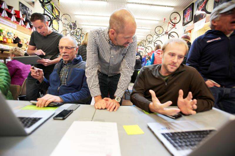 Iron Horse Bicycle Classic race director Gaige Sippy, center, helps Ryan Hentz register for the 2015 event at Mountain Bike Specialists. To the left, Mike Todt, sitting, receives assistance from William Glenn.