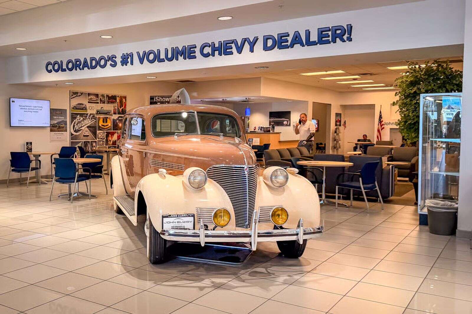 A vintage Chevrolet sits near the waiting area of John Elway Chevrolet in Englewood. (Nathan Fernando-Fescas/CPR News)