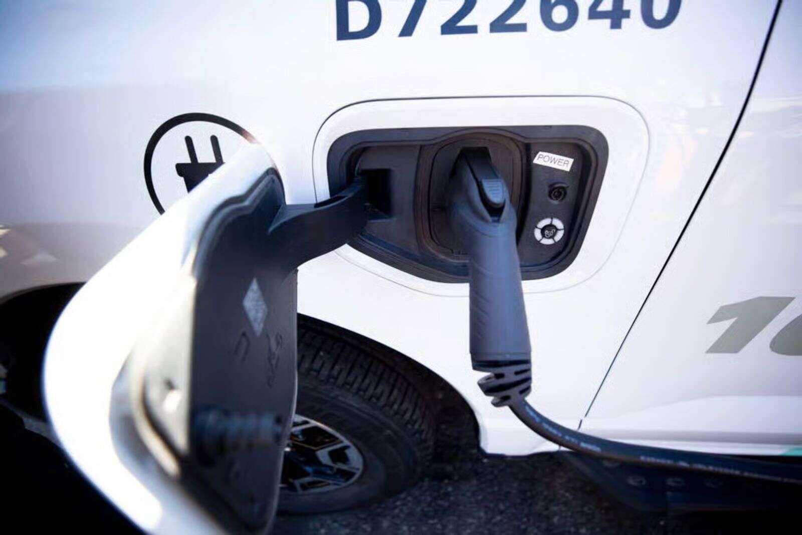 A new Buzze electric vehicle charging station juices up a Ford truck at Koelbel and Company's Sienna on Sloans Lake affordable apartments. Oct. 23, 2025. (Kevin J. Beaty/Denverite)