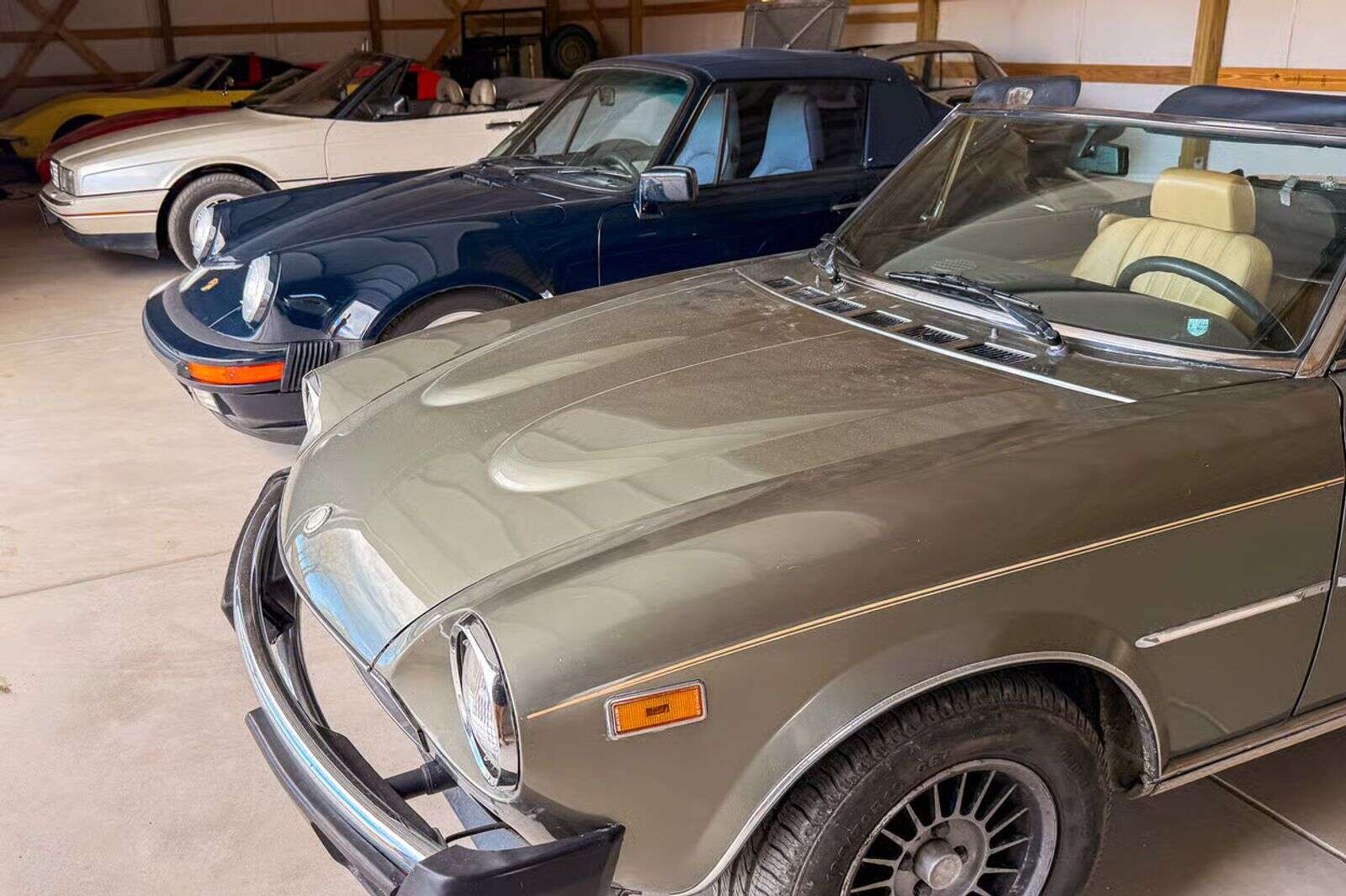 Numerous vintage vehicles sit in a large garage on the TFL Car ranch in Berthoud, Colorado. They include a Fiat, Porsche, Cadillac and Chevrolet (front to back). The selling price of these vehicles ranges from less than $1,000 to more than $40,000. TFL uses these vehicles in their online content, highlighting the interesting stories and features of each. (Nathan Fernando-Fescas/CPR News)
