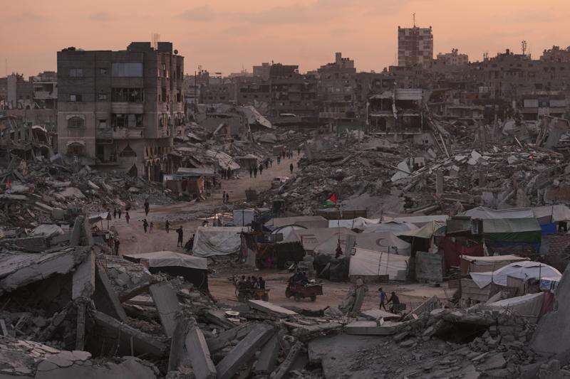 Palestinians walk through the destruction caused by the Israeli air and ground offensive in Sheikh Radwan neighborhood in Gaza City, Tuesday, Nov. 11, 2025. (AP Photo/Jehad Alshrafi)