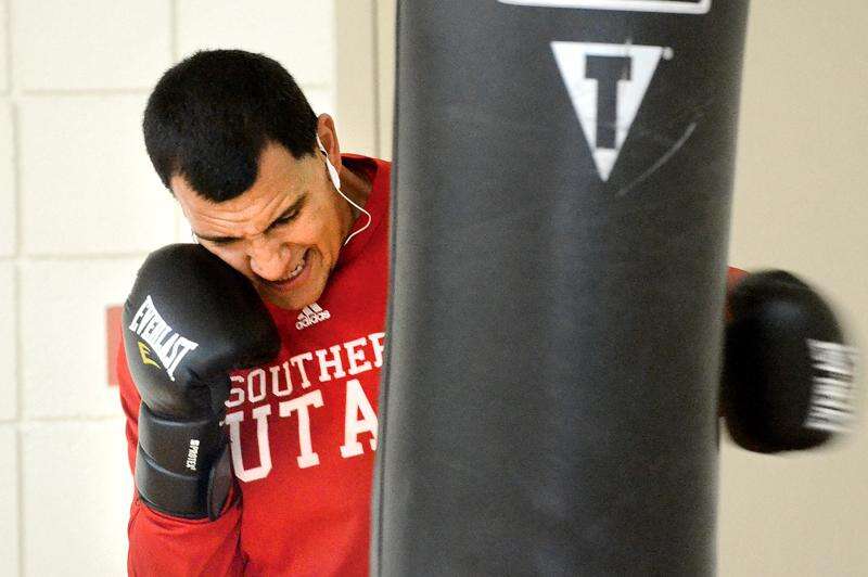 Orlando Griego gets after the heavy bag at the Durango Community Recreation Center on Wednesday afternoon. Griego says that while basketball is his first love, it’s nice to change things up with a kick boxing workout.