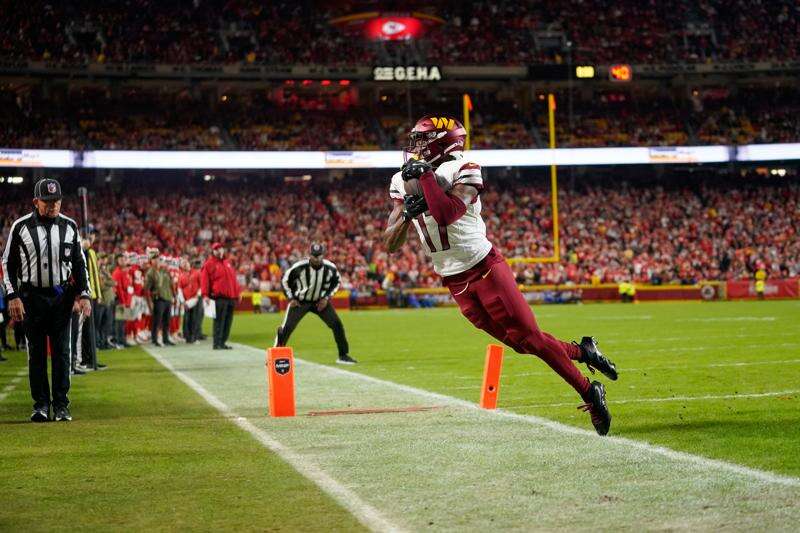 Washington Commanders wide receiver Terry McLaurin catches a touchdown pass during the first half of an NFL football game against the Kansas City Chiefs Monday, Oct. 27, 2025, in Kansas City, Mo. (AP Photo/Ed Zurga)