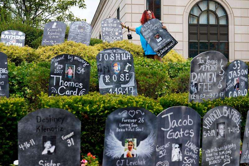 FILE - Jayde Newton helps to set up cardboard gravestones with the names of victims of opioid abuse outside the courthouse where the Purdue Pharma bankruptcy is taking place in White Plains, N.Y., on Aug. 9, 2021. (AP Photo/Seth Wenig, File)