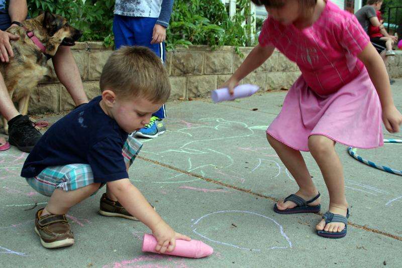 Jaxon Emery uses some sidewalk chalk at the July 20 Bayfield Block Party as big sister Ava give him some instructions on drawing properly.
