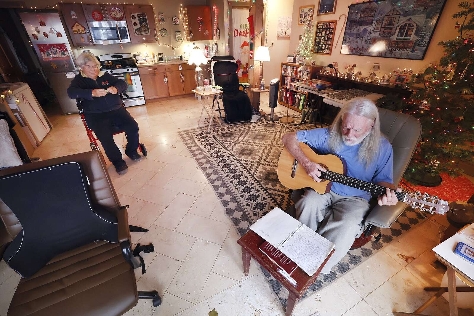 Meme Jason listens to her husband Al Jason, 78, play his guitar on Dec. 3, at their La Plata County home. Al was diagnosed with Alzheimer’s disease last year and has had to write down all the songs he knows in order to remember the words and chords. (Jerry McBride/Durango Herald)