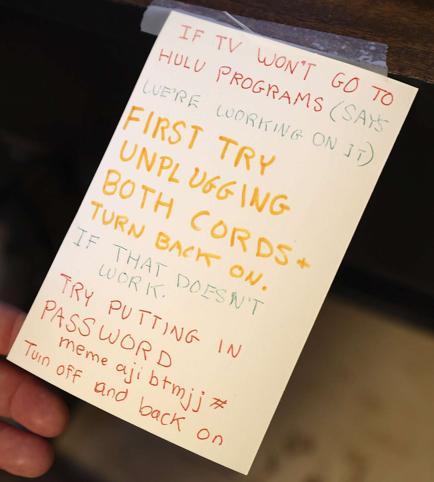 “If TV won’t go to Hulu programs (says we’re working on it), first try unplugging both cords + turn back on,” one note written in red and yellow marker read. “If that doesn’t work, try putting in password.”