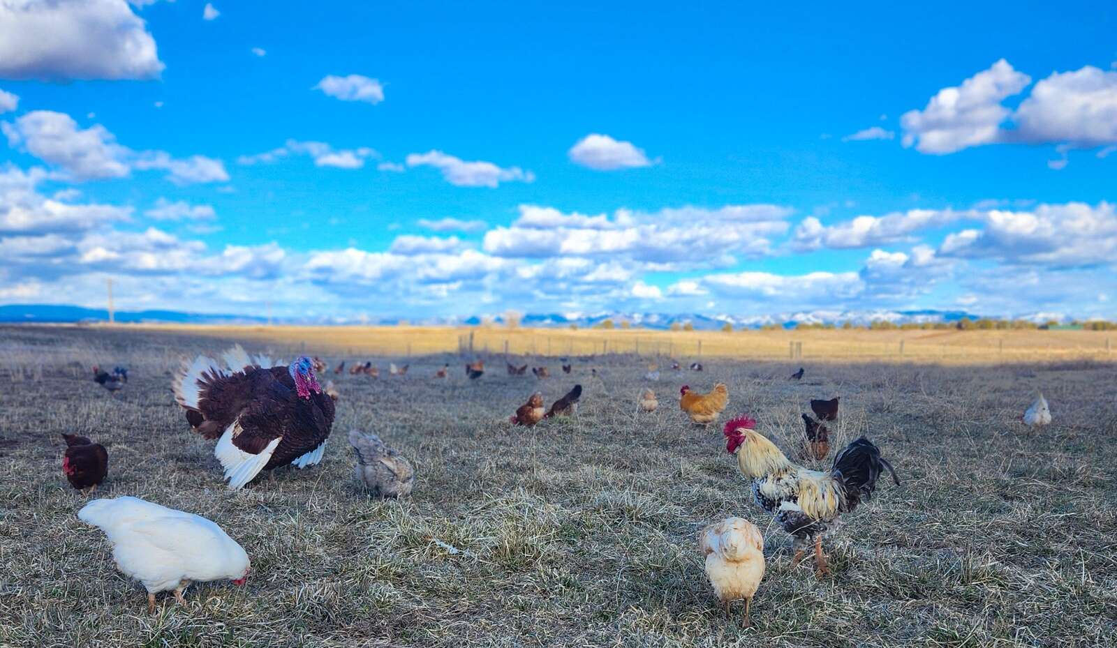 A flock of 58 birds roam freely, graze for bugs and plants, and roost in a warm shed, protected from wild animals by livestock guardian dogs.