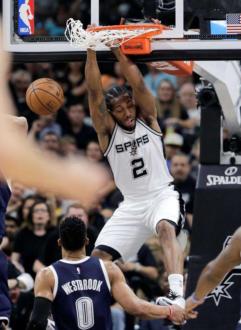 Westbrook shook his head and cringed when he saw Oklahoma City coach Billy Donovan signal for him to run a play after the Thunder’s electric point guard slowly brought the ball upcourt and looked toward the bench in an apparent desire for a timeout with San Antonio up 17-6. That play would lead to a breakaway dunk by Leonard, which prompted Donovan to call a timeout.