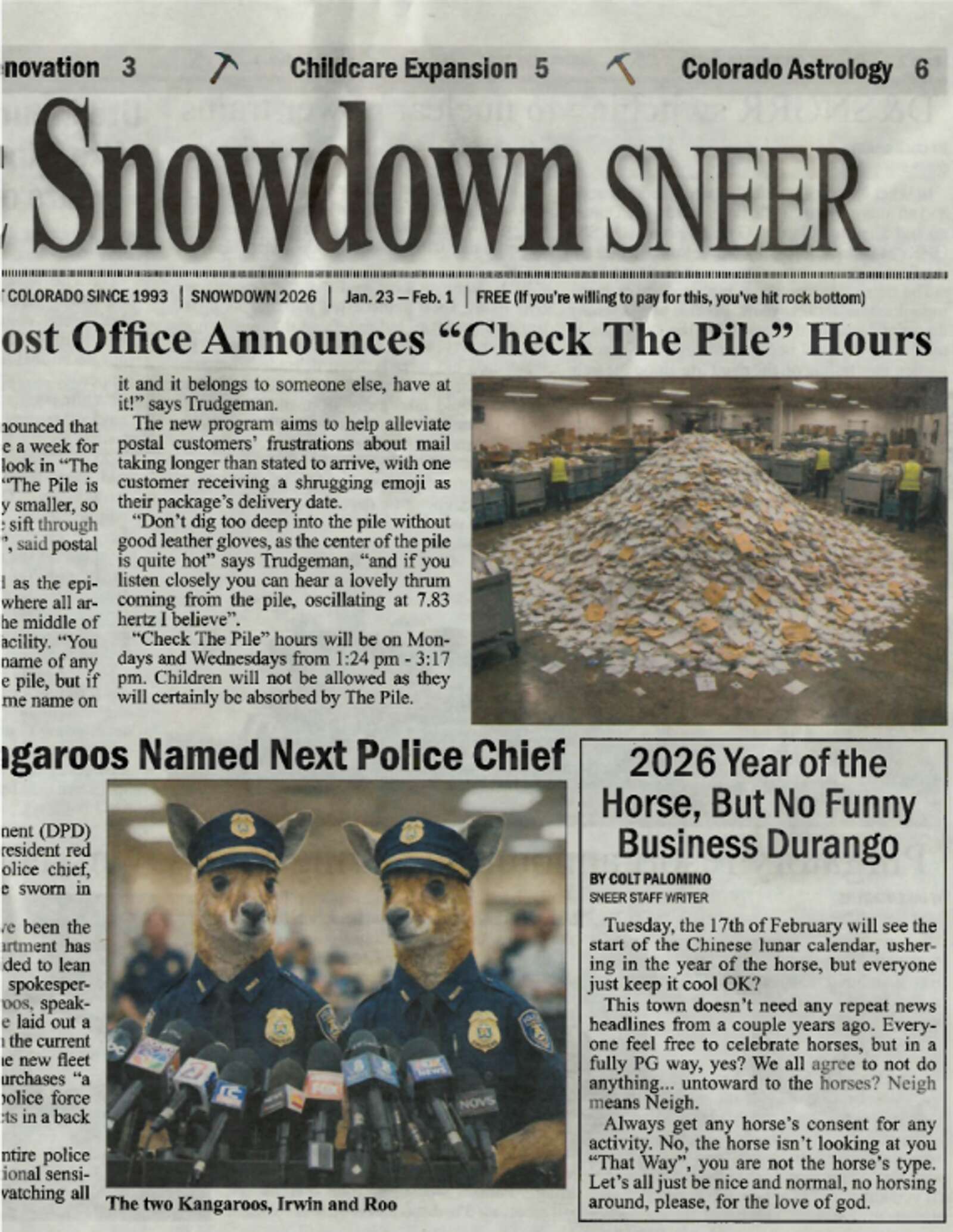 Front and center on the front page, the Sneer mocks slow mail delivery in an article announcing residents are welcome to visit the Durango Post Office and dive into “The Pile” to find their mail.