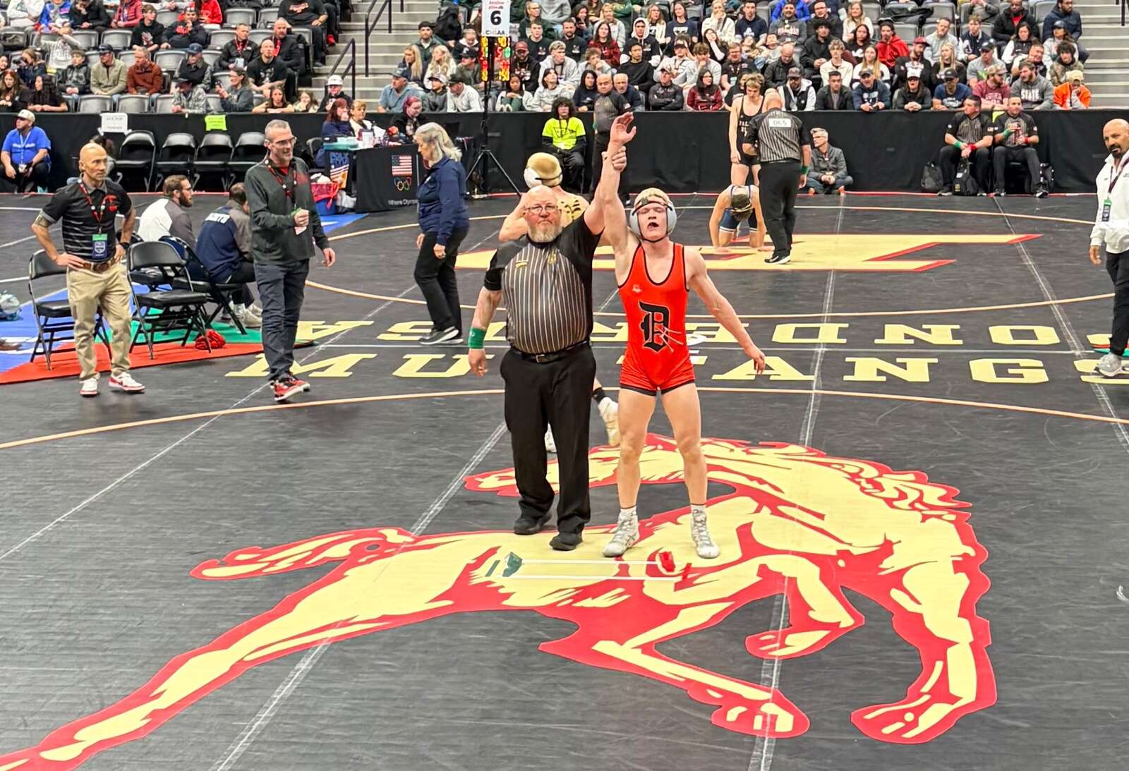 Durango High School boys wrestling sophomore Ryder Martyn is victorious at the 2026 CHSAA State Wrestling Tournament in Ball Arena in Denver last week. (Courtesy Michelle Martyn)
