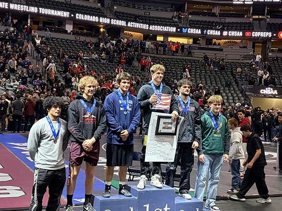 Durango High School boys wrestling senior Jacob Belt stands on the podium after finishing fourth at 175 pounds in 4A in the 2026 CHSAA State Wrestling Tournament in Ball Arena in Denver on Saturday. (Courtesy Chelsey Belt)