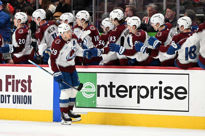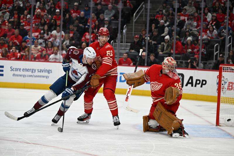 DETROIT (AP) — Nathan MacKinnon scored twice to become the league's first 40-goal scorer this season and the Colorado Avalanche continued their dominance of Detroit with a 5-0 victory over the Red Wings on Saturday.