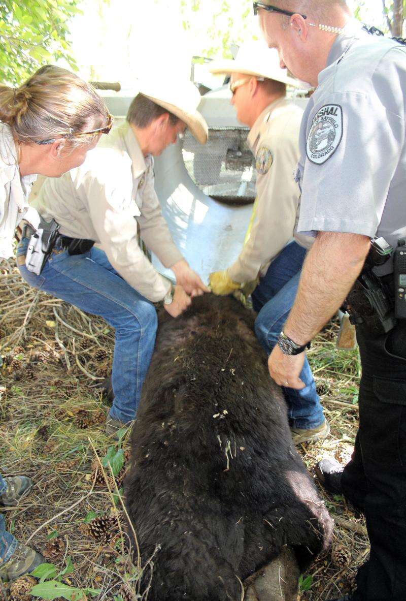 The male bear weighs at least 300 pounds, and probably more, said Stephanie Schuler, district wildlife manager for Colorado Parks and Wildlife. She and three other agents showed up to get the bruin tranquilized and loaded into a trap before school let out. Assistant Principal Bill Hesford was on hand to make sure no students tried to get out of school early to go see the animal.
